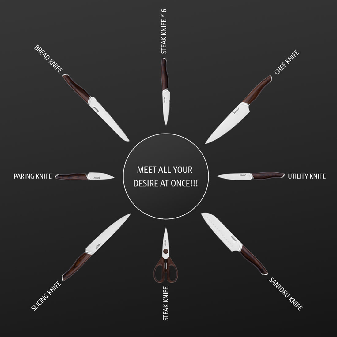 CUCHILLO MULTIUSO: un cuchillo de cocina versátil que se puede utilizar para una variedad de trabajos, desde rebanar y picar verduras hasta recortar la grasa del tocino, cortar carne y pelar frutas y verduras.